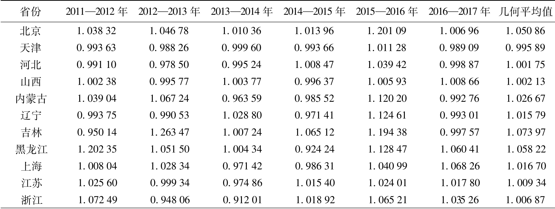 省份 2011—2012年 2012—2013年 2013—2014年 2014—2015年 2015—2016年 2016—2017年 几何平均值北京 1.038 32 1.046 78 1.010 36 1.013 96 1.201 09 1.00 6 96 1.050 86天津 0.993 63 0.988 26 0.999 60 0.993 66 1.011 28 0.989 09 0.995 89河北 0.991 10 0.978 50 0.995 24 1.008 47 1.039 42 0.998 87 1.001 75山西 1.002 38 0.995 77 1.003 77 0.996 37 1.005 93 1.008 66 1.002 13内蒙古 1.039 04 1.067 24 0.963 59 0.985 52 1.120 20 0.992 76 1.026 67辽宁 0.993 75 0.990 53 1.028 80 0.971 41 1.124 61 0.993 01 1.015 79吉林 0.950 14 1.263 47 1.007 24 1.065 12 1.194 38 0.997 57 1.073 97黑龙江 1.202 35 1.051 50 1.004 34 0.924 24 1.128 47 1.060 41 1.058 22上海 1.008 04 1.028 34 0.971 42 0.986 31 1.040 99 1.068 26 1.016 70江苏 1.025 60 0.999 34 0.974 86 1.015 40 1.024 01 1.017 80 1.009 34浙江 1.072 49 0.948 06 0.912 01 1.018 92 1.065 21 1.03 5 26 1.006 87