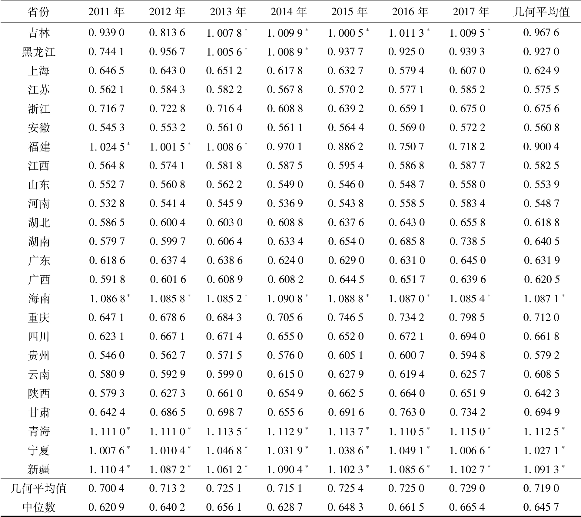 省份 2011年 2012年 2013年 2014年 2015年 2016年 2017年 几何平均值吉林 0.939 0 0.813 6 1.007 8*1.009 9*1.000 5*1.011 3*1.009 5*0.967 6黑龙江 0.744 1 0.956 7 1.005 6*1.008 9*0.937 7 0.925 0 0.939 3 0.927 0上海 0.646 5 0.643 0 0.651 2 0.617 8 0.632 7 0.579 4 0.607 0 0.624 9江苏 0.562 1 0.584 3 0.582 2 0.567 8 0.570 2 0.577 1 0.585 2 0.575 5浙江 0.716 7 0.722 8 0.716 4 0.608 8 0.639 2 0.659 1 0.675 0 0.675 6安徽 0.545 3 0.553 2 0.561 0 0.561 1 0.564 4 0.569 0 0.572 2 0.560 8福建 1.024 5*1.001 5* 1.008 6*0.970 1 0.886 2 0.750 7 0.718 2 0.900 4江西 0.564 8 0.574 1 0.581 8 0.587 5 0.595 4 0.586 8 0.587 7 0.582 5山东 0.552 7 0.560 8 0.562 2 0.549 0 0.546 0 0.548 7 0.558 0 0.553 9河南 0.532 8 0.541 4 0.545 9 0.536 9 0.543 8 0.558 5 0.583 4 0.548 7湖北 0.586 5 0.600 4 0.603 0 0.608 8 0.637 6 0.643 0 0.655 8 0.618 8湖南 0.579 7 0.599 7 0.606 4 0.633 4 0.654 0 0.685 8 0.738 5 0.640 5广东 0.618 6 0.637 4 0.638 6 0.624 0 0.629 0 0.631 0 0.645 0 0.631 9广西 0.591 8 0.601 6 0.608 9 0.608 2 0.644 5 0.651 7 0.639 6 0.620 5海南 1.086 8*1.085 8* 1.085 2*1.090 8*1.088 8*1.087 0*1.085 4* 1.087 1*重庆 0.647 1 0.678 6 0.684 3 0.705 6 0.746 5 0.734 2 0.798 5 0.712 0四川 0.623 1 0.667 1 0.671 4 0.655 0 0.652 0 0.672 1 0.694 0 0.661 8贵州 0.546 0 0.562 7 0.571 5 0.576 0 0.605 1 0.600 7 0.594 8 0.579 2云南 0.580 9 0.592 9 0.599 0 0.615 0 0.627 9 0.619 4 0.625 7 0.608 5陕西 0.579 3 0.627 3 0.661 0 0.654 9 0.662 5 0.664 0 0.651 9 0.642 3甘肃 0.642 4 0.686 5 0.698 7 0.655 6 0.691 6 0.763 0 0.734 2 0.694 9青海 1.111 0*1.111 0* 1.113 5*1.112 9*1.113 7*1.110 5*1.115 0* 1.112 5*宁夏 1.007 6*1.010 4* 1.046 8*1.031 9*1.038 6*1.049 1*1.006 6* 1.027 1*新疆 1.110 4*1.087 2* 1.061 2*1.090 4*1.102 3*1.085 6*1.102 7* 1.091 3*几何平均值 0.700 4 0.713 2 0.725 1 0.715 1 0.725 4 0.725 0 0.7 29 0 0.719 0中位数 0.620 9 0.640 2 0.656 1 0.628 7 0.648 3 0.661 5 0.6 65 4 0.645 7