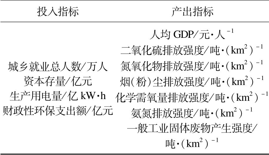 投入指标 产出指标城乡就业总人数/万人资本存量/亿元生产用电量/亿kW·h财政性环保支出额/亿元人均GDP/元·人-1二氧化硫排放强度/吨·(km2)-1氮氧化物排放强度/吨·(km2)-1烟(粉)尘排放强度/吨·(km2)-1化学需氧量排放强度/吨·(km2)-1氨氮排放强度/吨·(km2)-1一般工业固体废物产生强度/吨·(km2)-1