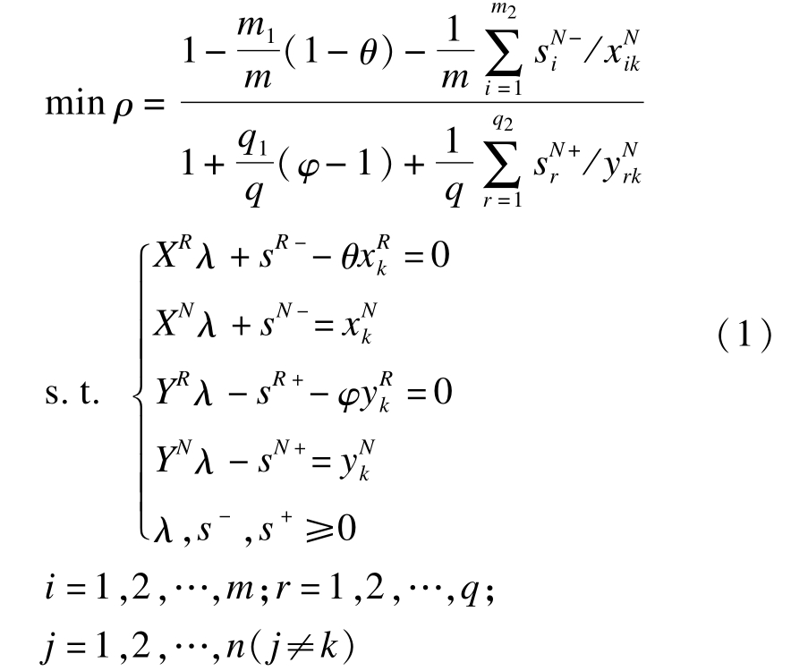 式中:上标N表示非径向指标、R表示径向指标;m为投入指标数量,其中m1为径向指标数量,m2为非径向指标数量;q为产出指标数量,其中q1为径向指标数量,q2为非径向指标数量[8];j表示第j个从参考集中剔除的需要测算超效率的DMU。